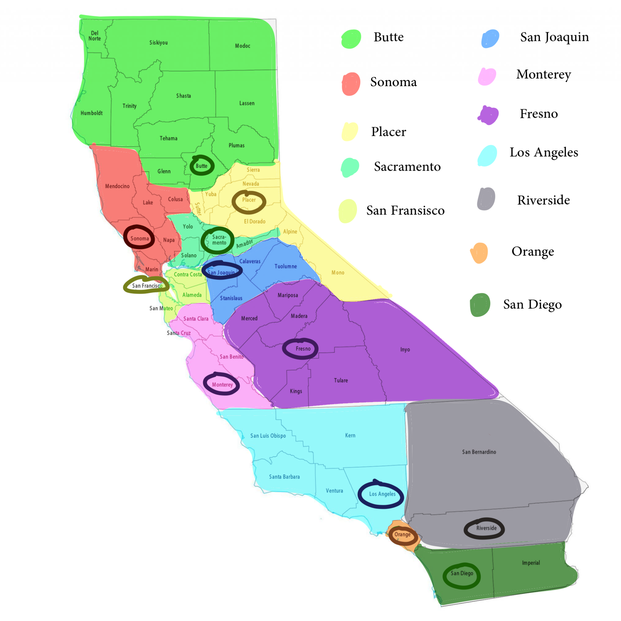 The current regions in the CA YSN - based on membership interest and Regional Director availability. Circles represent the home counties of each region.